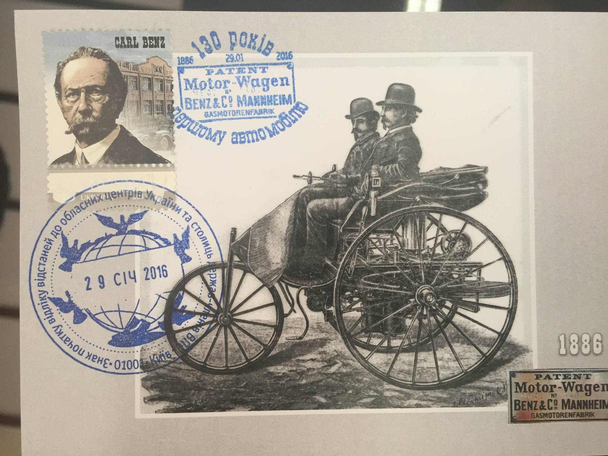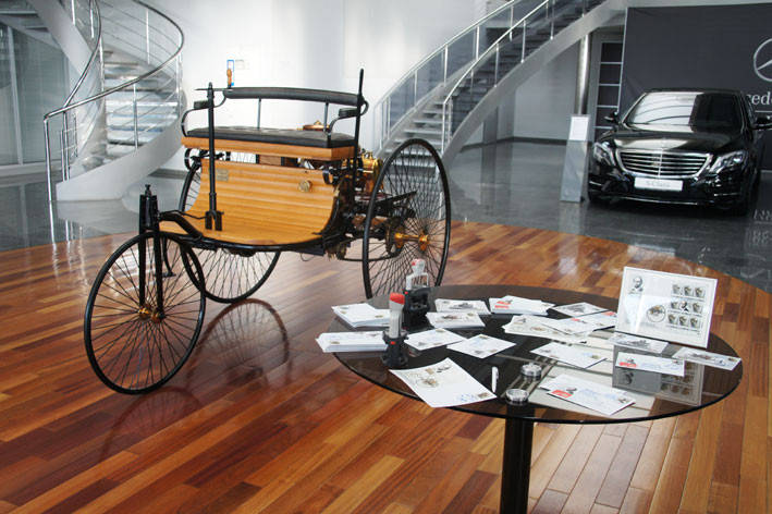 30 января 2016 года состоялось торжественное мероприятие по случаю выпуска Союзом филателистов Украины коллекционной почтовой марки, приуроченной к 130-летию создания первого автомобиля в истории человечества. Дилерский центр "Автомобильный Дом Украина-Мерседес Бенц" предоставил уникальную реплику первого автомобиля для осуществления церемонии гашения почтовой марки. В рамках совместного мероприятия с Клубом технического антиквариата NOVA MOTORS и издательством «Козацька Пошта» был презентован коллекционный набор конвертов, открыток и марок и произведено гашение специальными штемпелями. Авторы-разработчики марки – Виктор Зинченко (Киев) и Андрей Пелюх (Львов).