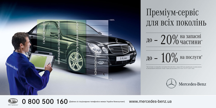 Идеальное качество и совершенство каждой детали, в котором убедились владельцы Mercedes-Benz, надолго гарантирует наилучшие эксплуатационные характеристики этих автомобилей. Лишь в сети официальных сервисных станций Mercedes-Benz предлагается безупречный сервис и наивысший уровень комфорта для всех посетителей. Выбирая оригинальные запасные части в фирменных сервисных центрах Mercedes-Benz, клиенты приобретают продукт, идеально соответствующий автомобилю. Только с оригинальными запасными частями Mercedes-Benz остается настоящим. Акция распространяет свое действие на всю территорию Украины, на все авторизованные дилерские станции Mercedes-Benz.