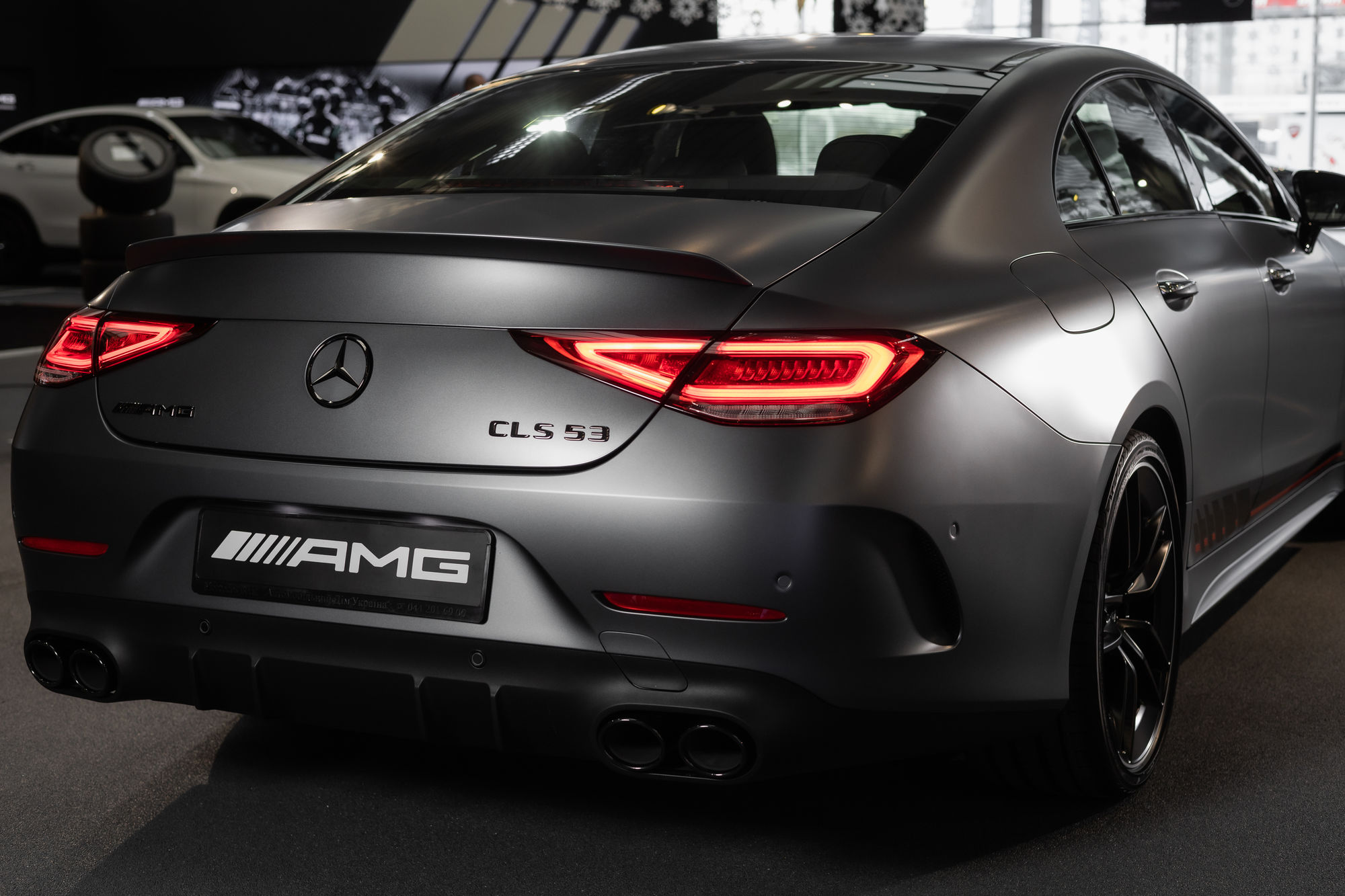 - Серед нововведень, що серійно застосовуються на CLS 53 4MATIC +, по-новому оформлена передня частина кузова зі спортивним бампером AMG у формі елемента A-Wing з чорними дефлекторами і повітряними екранами (Air Curtains), а також характерна для AMG решітка радіатора з вертикальними ламелями. Обрамлення скла виконується з полірованого алюмінію або у глянцевому чорному варіанті – при замовленні пакету Night. Зовнішні дзеркала заднього виду фарбуються у колір кузова. Два нових пакета оснащення (опція): AMG Night II (в комбінації з пакетом AMG Night) і пакет AMG DYNAMIC PLUS.